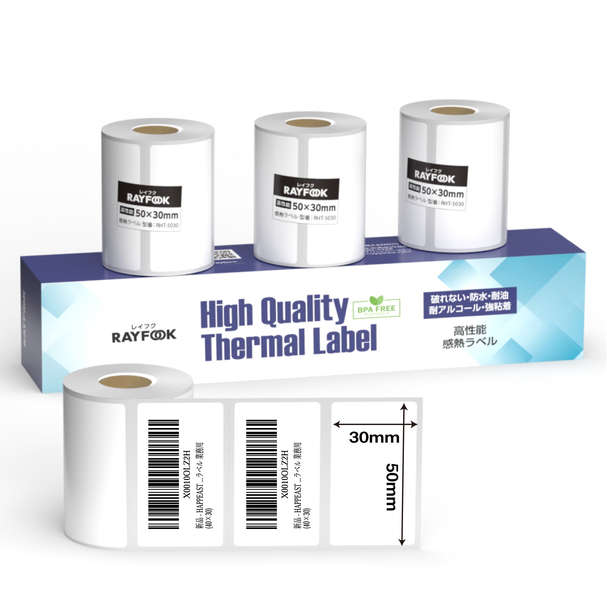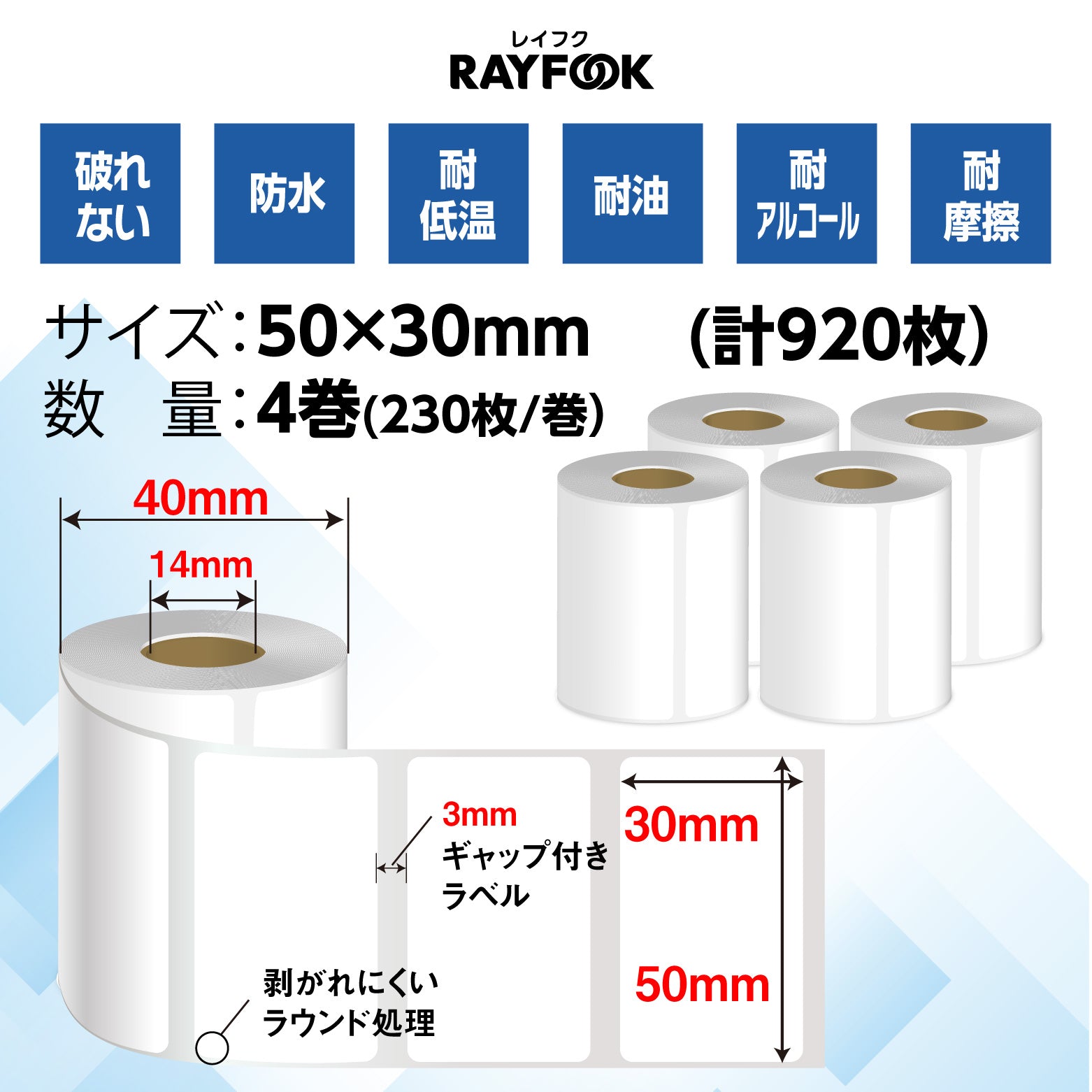 防水 高性能感熱ラベルシール 50×30mm 【230枚×4巻=920枚】感熱シール 配送ラベル印刷 感熱ラベルプリンター専用 サーマルラベル用紙 小型ラベルプリンター用 FBAラベル phomemo M110互換品 [RAYFOOK RHTシリーズ]